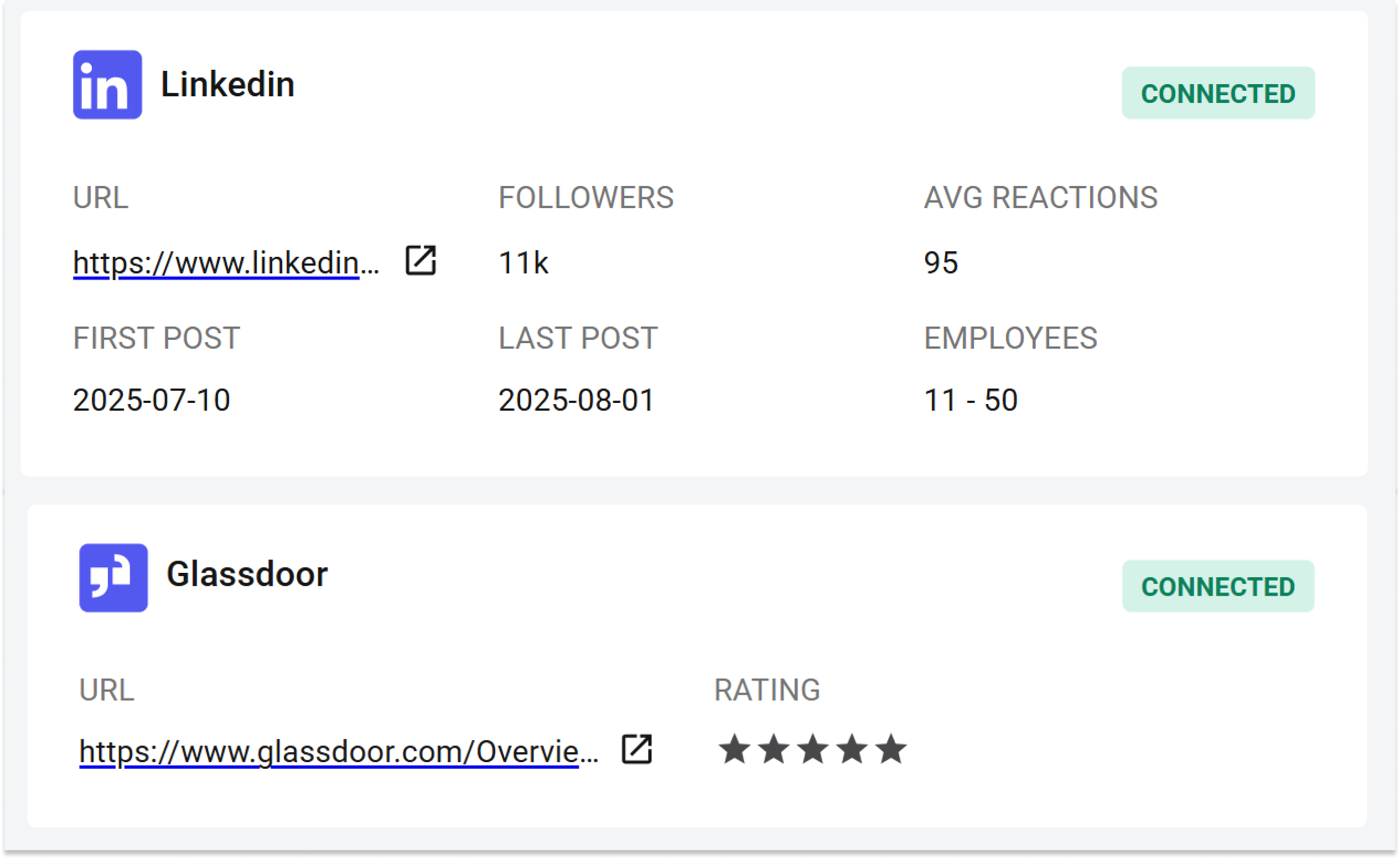 - 📊 Company statistics: Followers, employee count, verification status, and post activity to gauge reach and authenticity