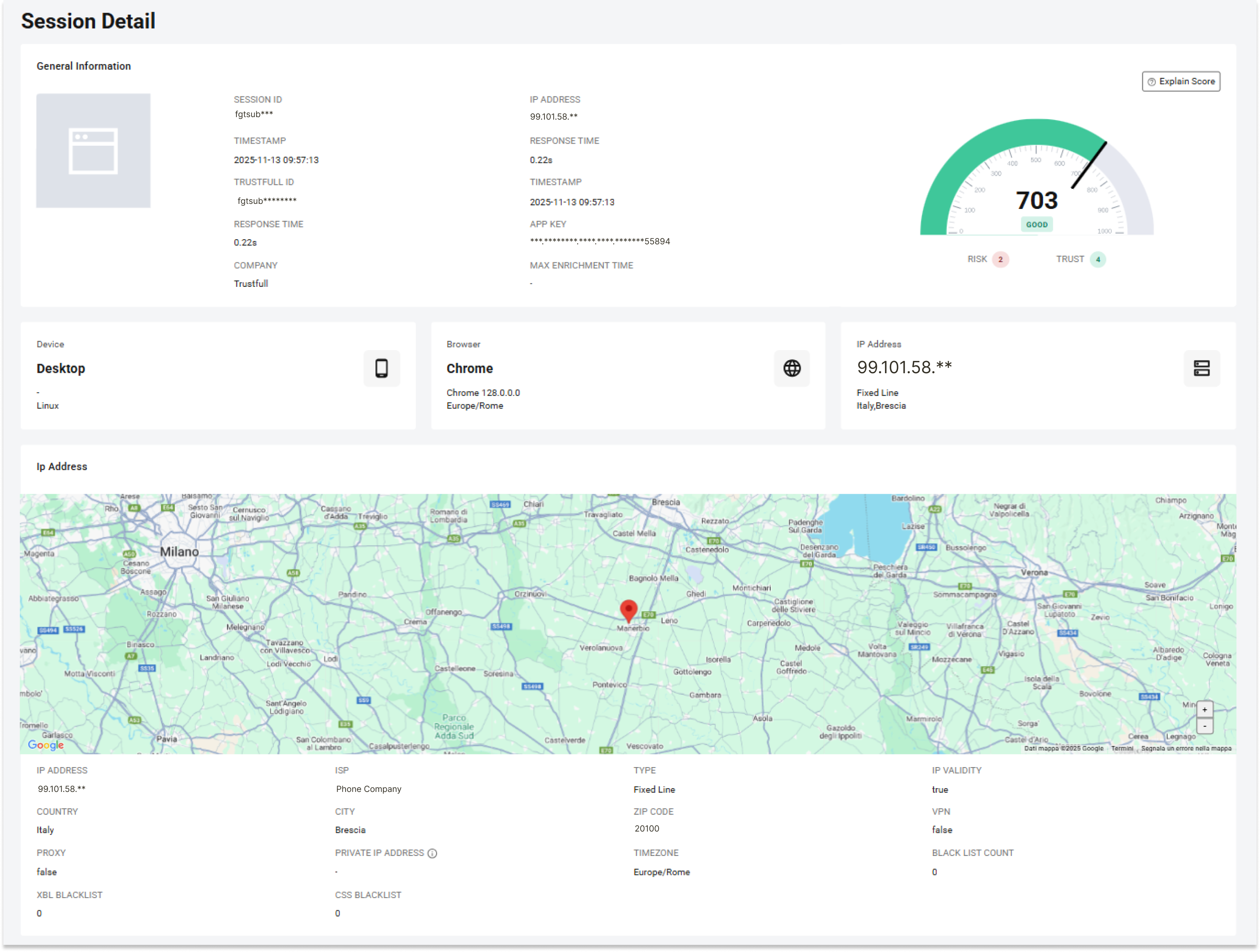 - 🌐 Network intelligence: IP risk, hosting/VPN/proxy flags, blacklist recency and counts, ISP type, geo and timezone consistency.