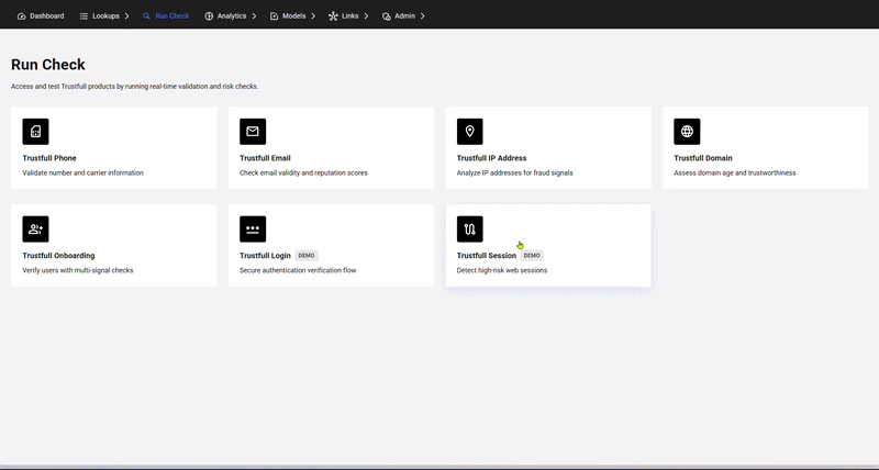 🌱 February 2026 Update: Run Check has a refreshed interface with a brand new Session check, the new MCP Server lets you run Trustfull checks directly from AI agents, and two new Low Latency APIs deliver phone and email enrichment in under 500ms.