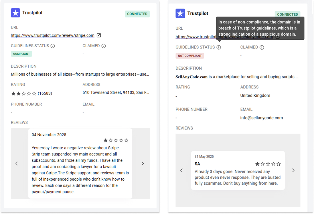 - ⚠ Guideline violations — Whether the domain is in breach of Trustpilot’s guidelines.