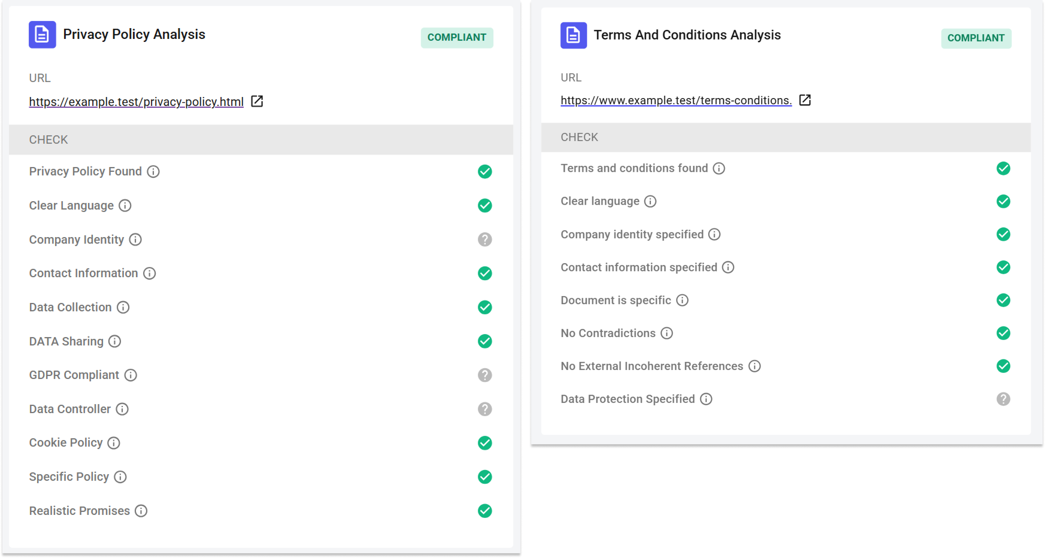 - 🧠 AI compliance checks: Automatic flags for clarity, company identity, contact info, data collection and sharing, GDPR alignment, and cookie policy.
