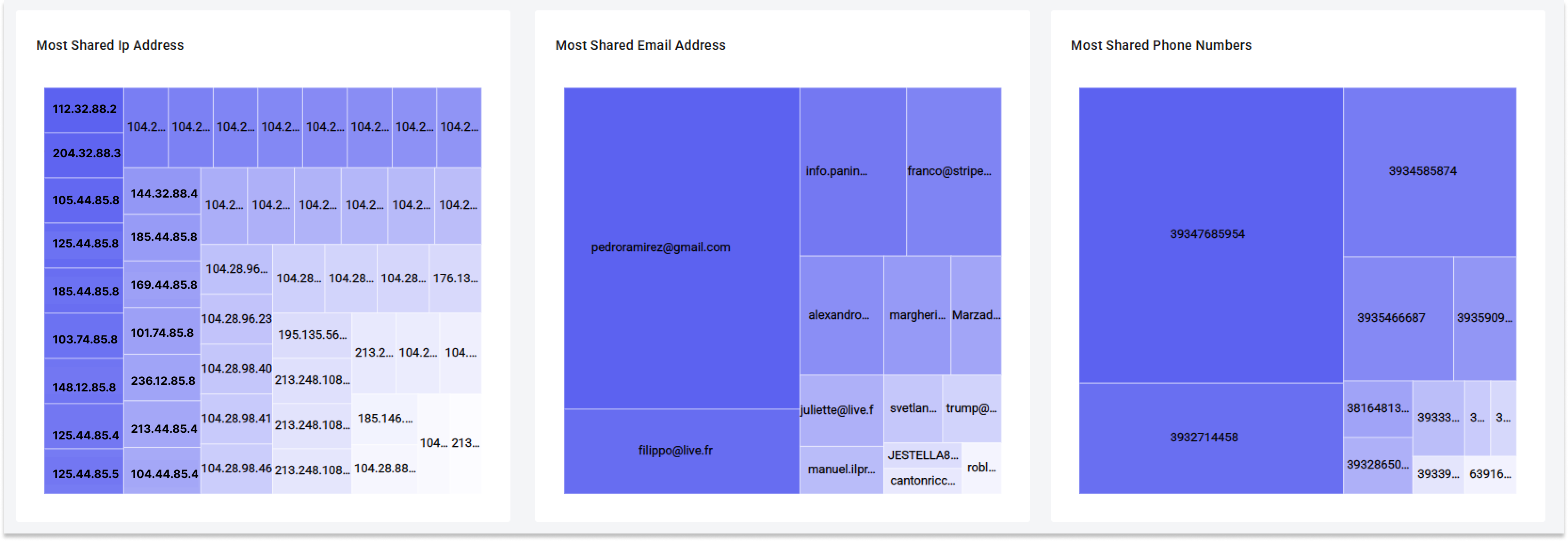 While a single link is represented in the graph, a representation of all the links data for a selected timeframe is available in the Link Analytics page, dedicated to analyzing links across records collected. The page shows the number of links identified for a phone/email/IP over a chosen period, surfacing the most frequently reused emails, phone numbers, and IPs to highlight shared‑identity risk.