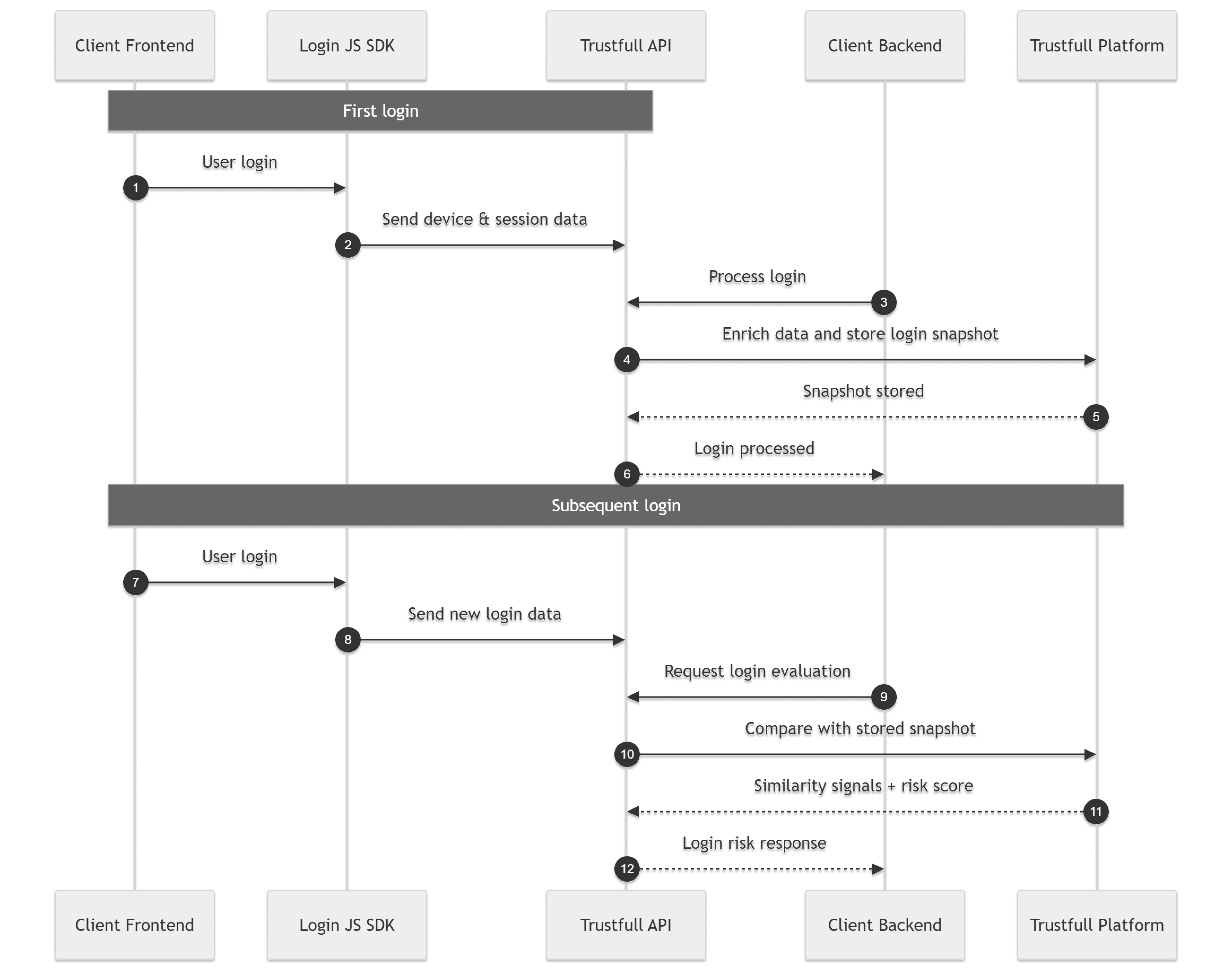 The diagram below illustrates the full integration flow: from initial data collection during the first login and enrollment creation, to subsequent login evaluations where new attempts are compared against stored user snapshots, resulting in similarity signals and a risk score returned to your application.