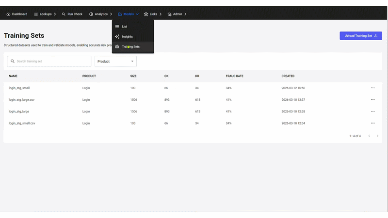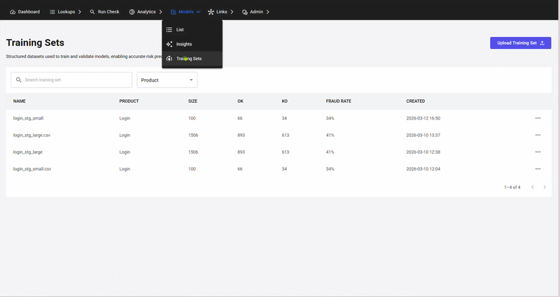 The Training Sets page lets you upload labelled datasets of past Trustfull lookups to measure how accurately the model's scores matched real-world outcomes for your traffic. Each training set is the input for generating Model Insights, a performance analysis of your scoring model.