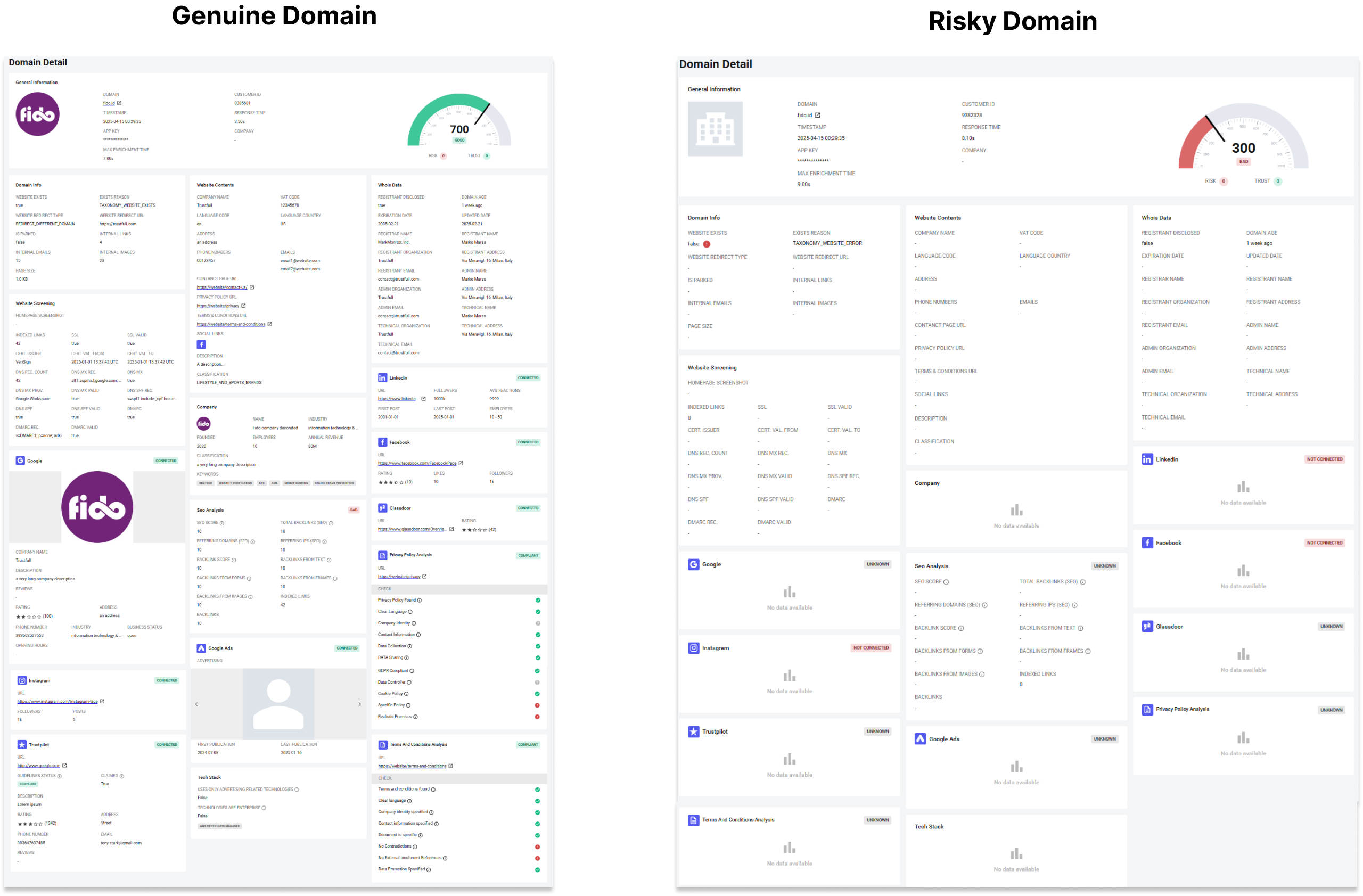 Trustfull Domain is designed to separate these two profiles in real time, enabling faster KYB, merchant due diligence, and fraud screening without penalizing legitimate businesses.