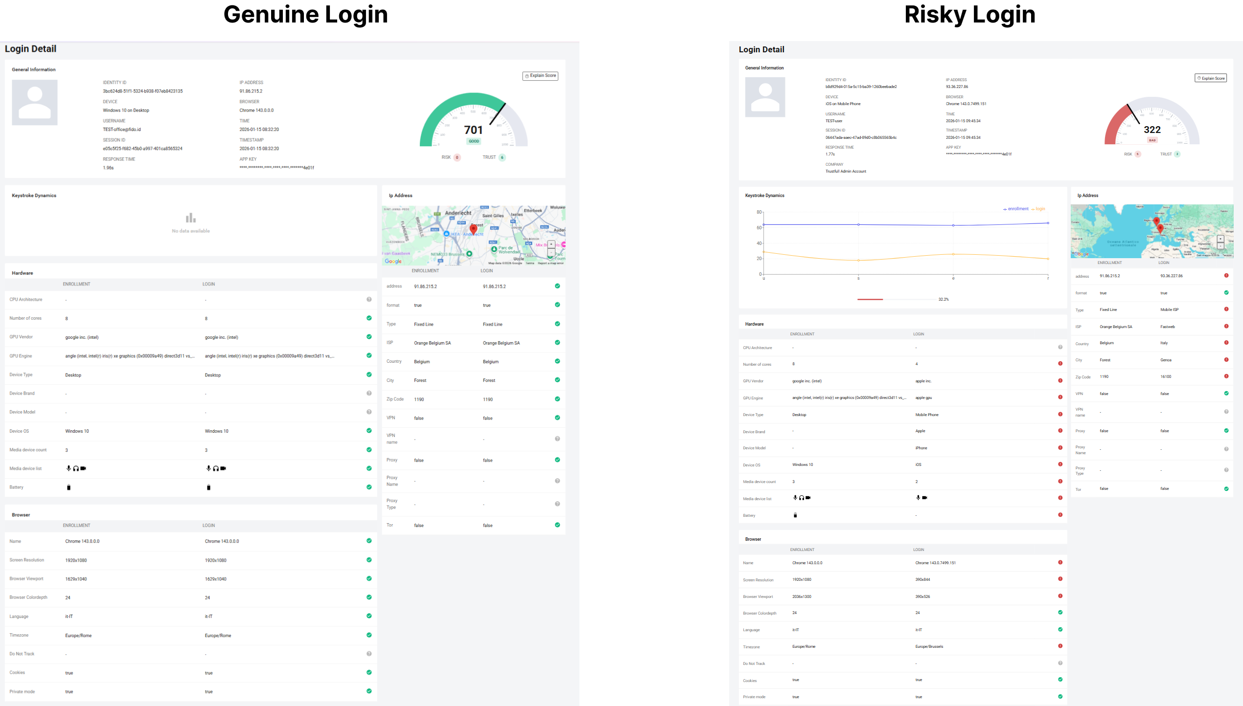 This makes it possible to detect account takeover, credential stuffing, and unauthorized access, while minimizing false positives for legitimate users logging in from familiar environments.
