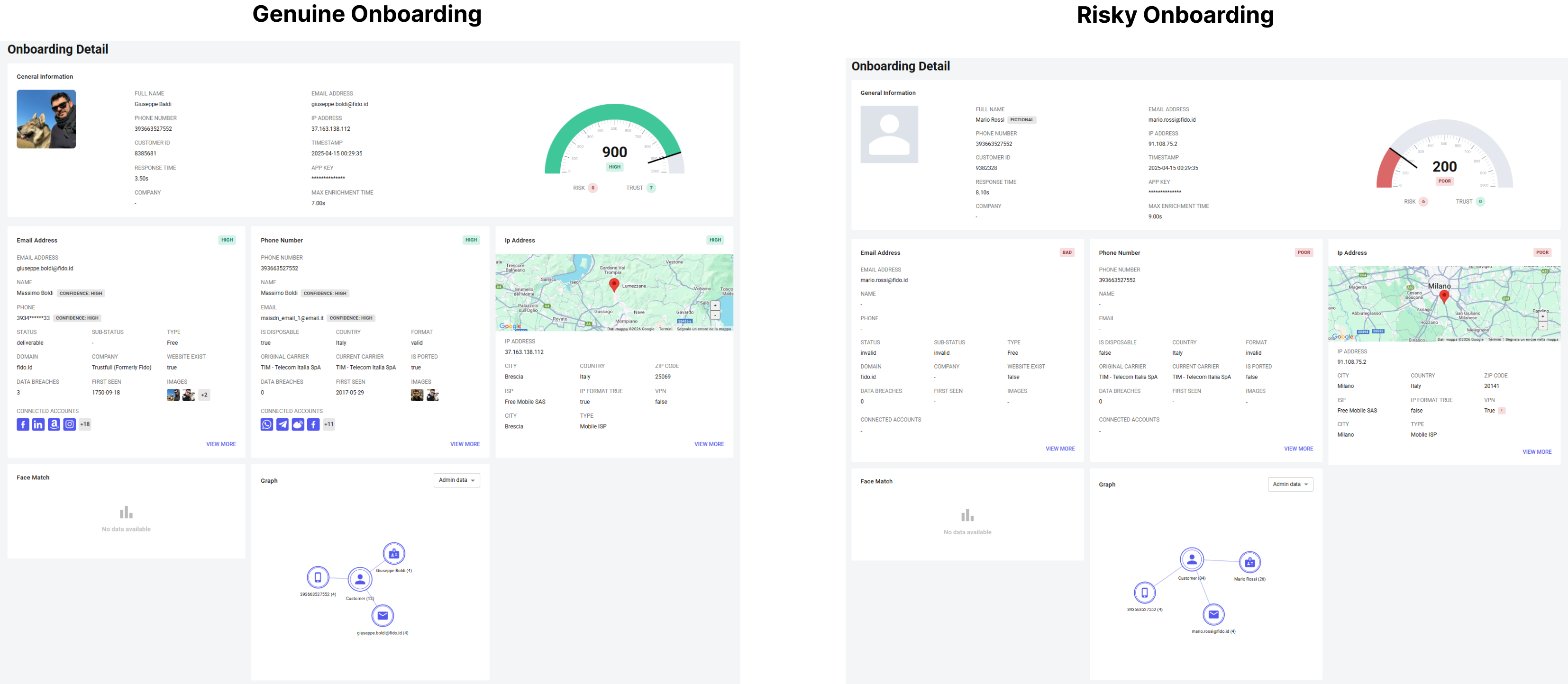 A high onboarding score indicates that individual signals are not only legitimate but also mutually consistent. Real users tend to present stable identity attributes that align naturally across email, phone, IP, images, and behavioral context.